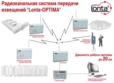 Система Lonta Optima обеспечивает централизованную пультовую радиоохрану распределенных территориально стационарных объектов. Отправка сигнала тревоги в случае несанкционированного вторжения или возникновения возгорания на объекте с установленных передатчиков осуществляется посредством уникального радиоканала. Дальность действия системы в городских условиях составляет 10 км и более, в условиях открытой местности – больше 20 км. Рабочая полоса частот системы Lonta Optima составляет 433,92 МГц ±0,2%. В пределах одного района или города могут одновременно функционировать до четырех таких систем.